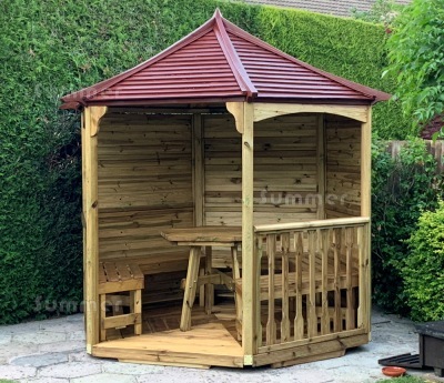 This hexagonal wooden gazebo is approximately 8'x7'. It features pressure treated timber throughout with an attractive wooden slatted roof. Heavy duty features include strong 3"x3" corner posts and a substantial timber floor with 4"x2" joists and 25mm thick decking. Three sides are fully boarded for extra privacy and protection from the elements. Two sides feature decorative balustrades with handrails. A decorative ridge finial is also included. A matching bench set is available as an option, comprising three or five benches. The set of five benches can seat up to ten people in this spacious gazebo. Further options include a hexagonal table and decorative arches. Pressure treatment is a lifetime preservative treatment. Instructions are supplied for self assembly. The floor, walls and roof are supplied as pre-fabricated panels which makes installation easier.