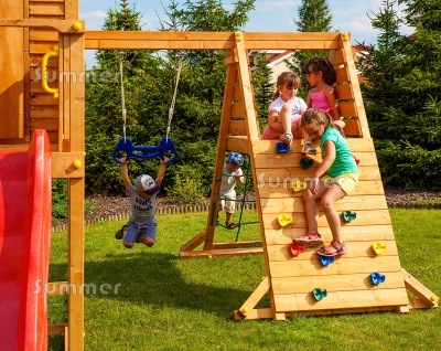 Climbing attachments are also a popular choice. This could be a simple climbing wall or ramp or a more elaborate climbing frame with a platform. Climbing walls and ramps may be vertical or sloping. Some climbing ramps include a rope so kids can pull themselves up the slope. Other climbing walls and ramps include multi-coloured moulded plastic climbing stones., which include galvanized steel fixings. The climbing stones include 2 fixings to avoid spinning. More elaborate climbing frames feature a ramp on one side with a rope climbing net on the other side, both leading to a platform. Some towers also include a climbing rope as an exciting feature.