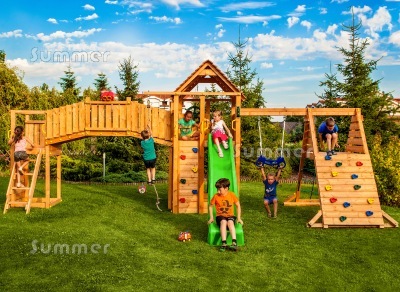Our smallest play centre is a single tower with a slide, size 10'x3' (3x0.9m). A medium sized playhouse could be a single tower with a slide and another attachment such as a swing, a ramp or a climbing tower. The largest play centres feature two towers with a bridge between the towers and a size of 24'x15' (7.3x4.6m). For some of our play centres we include the overall size and sometimes we also suggest how much space to allow around the play centre and the attachments. Ideally a 2 metre clearance is recommended.